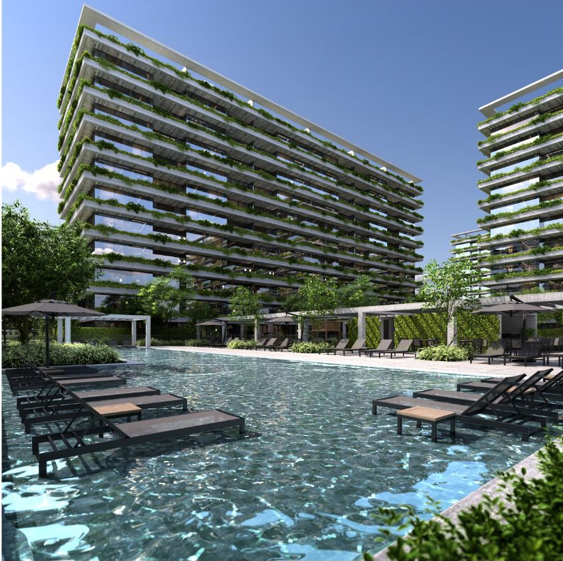 A fachada do empreendimento traz como premissa o protagonismo das áreas verdes, a iluminação natural, com seus grandes vãos de esquadrias e o teto de concreto aparente. Os elementos naturais se integram ao seu redor e a presença da vegetação traz mais conforto térmico e qualidade de vida. A harmonia entre arquitetura e paisagismo, com as jardineiras, se espalha verticalmente pelos andares, marcando a identidade do conjunto e ajudando a filtrar a visão dos apartamentos que se abrem para a paisagem da Barra e do Cidade Arte.